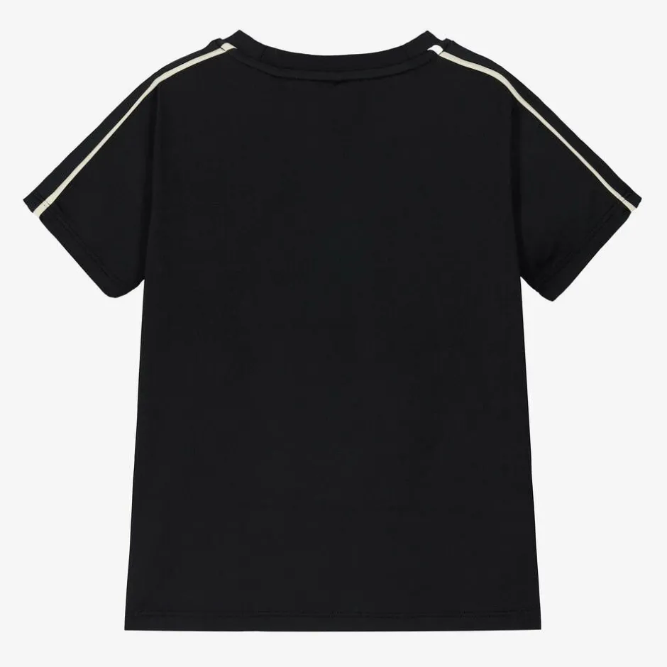 A sporty black T-shirt for boys and girls by Mini Rodini, made in silky smooth, stretchy jersey with ivory trims on each shoulder. Making movement easy, this short-sleeved top is made in breathable, quick dry fabric to keep them cool and dry on active days. A logo design is printed on the chest for brand recognition. This product contains recycled materials.