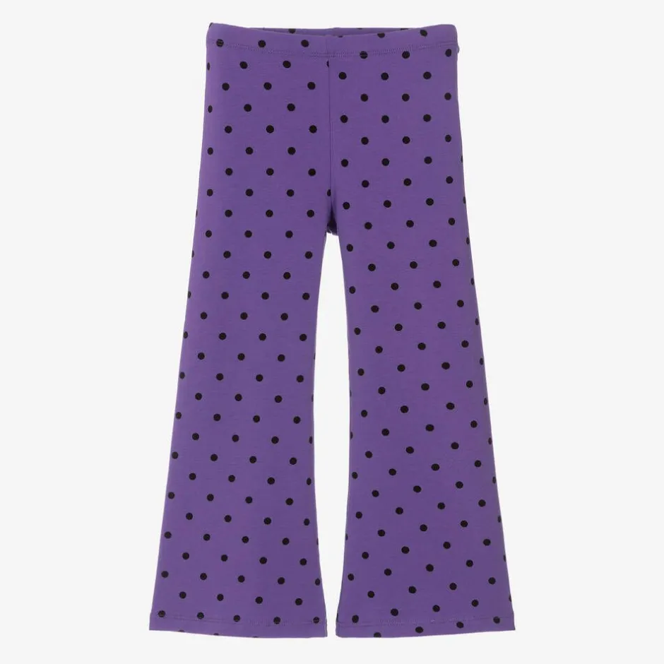 Purple leggings for girls by Swedish brand Mini Rodini, made in soft and stretchy organic cotton jersey. Easy to move around in, these full-length leggings have a flared leg silhouette and an elasticated waistband. They are printed with small black polka dots.