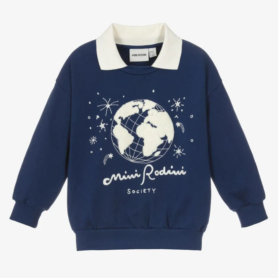 For boys and girls from Mini Rodini, a navy blue sweatshirt made in mid-weight organic cotton jersey. Made for comfort, this long-sleeved top has dropped shoulder seams for a relaxed look and a contrasting white collar that sits above the ribbed crew neck. An appliqué globe with embroidered detail and "Mini Rodini Society" on the front ensures brand recognition.