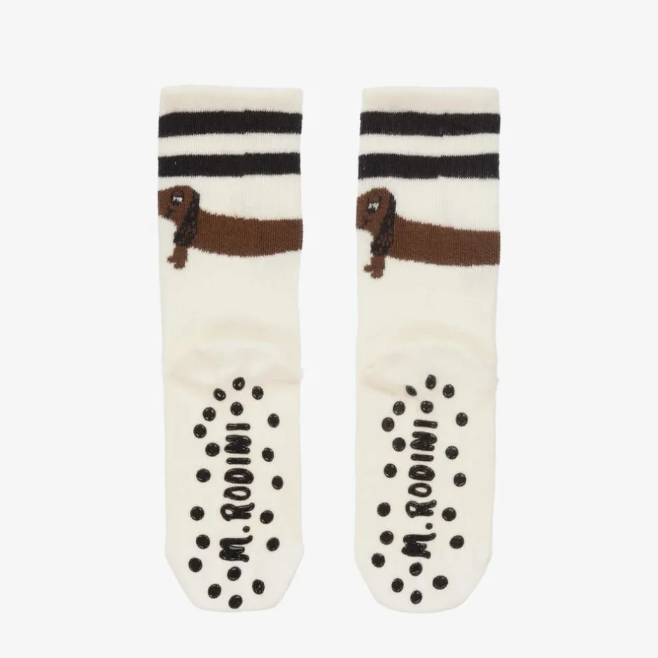 Off-white socks for boys and girls by Mini Rodini, made in a soft and stretchy organic cotton blend. They have a cute brown dog motif around each leg with sporty black stripes above. Rubbery black anti-slip dots and the designer's name are printed underfoot.