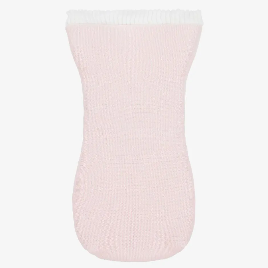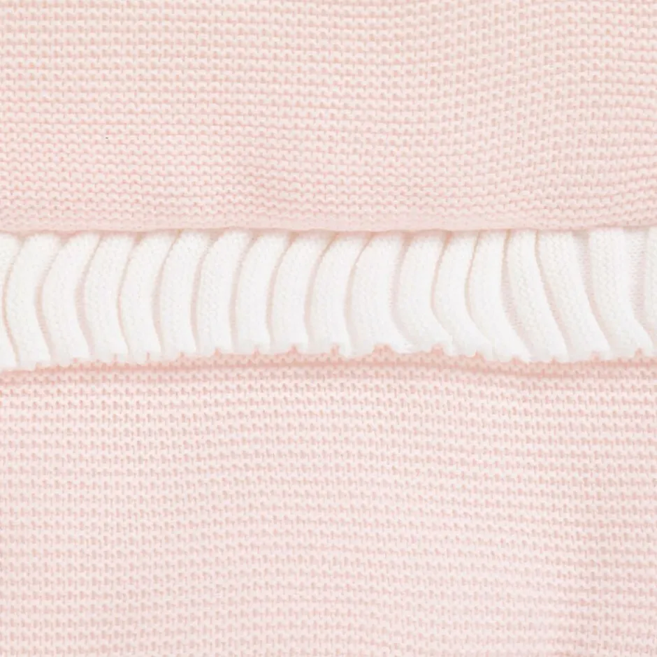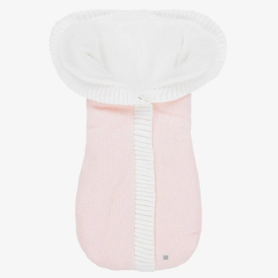 A lovely pale pink knitted baby nest for girls by Minutus. Beautifully soft and warmly padded, it has a white knitted lining and knitted ruffle trims. There is a concealed front zip fastening, with a small branded tab at the bottom.