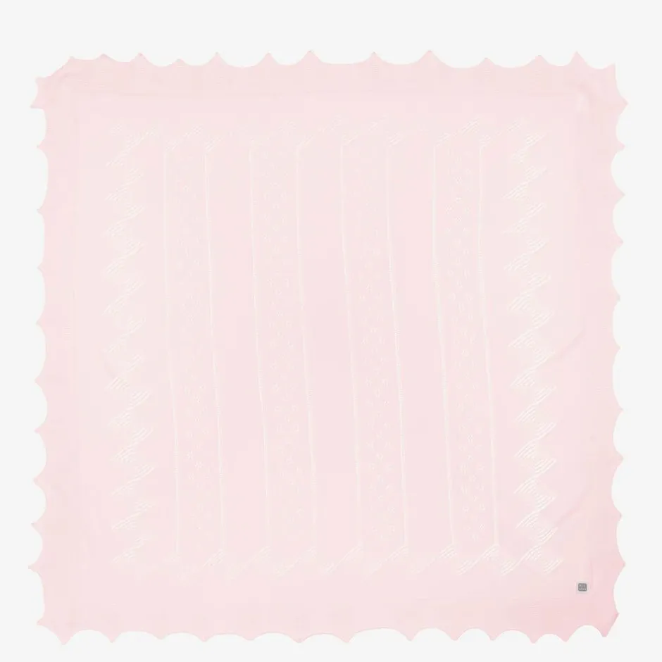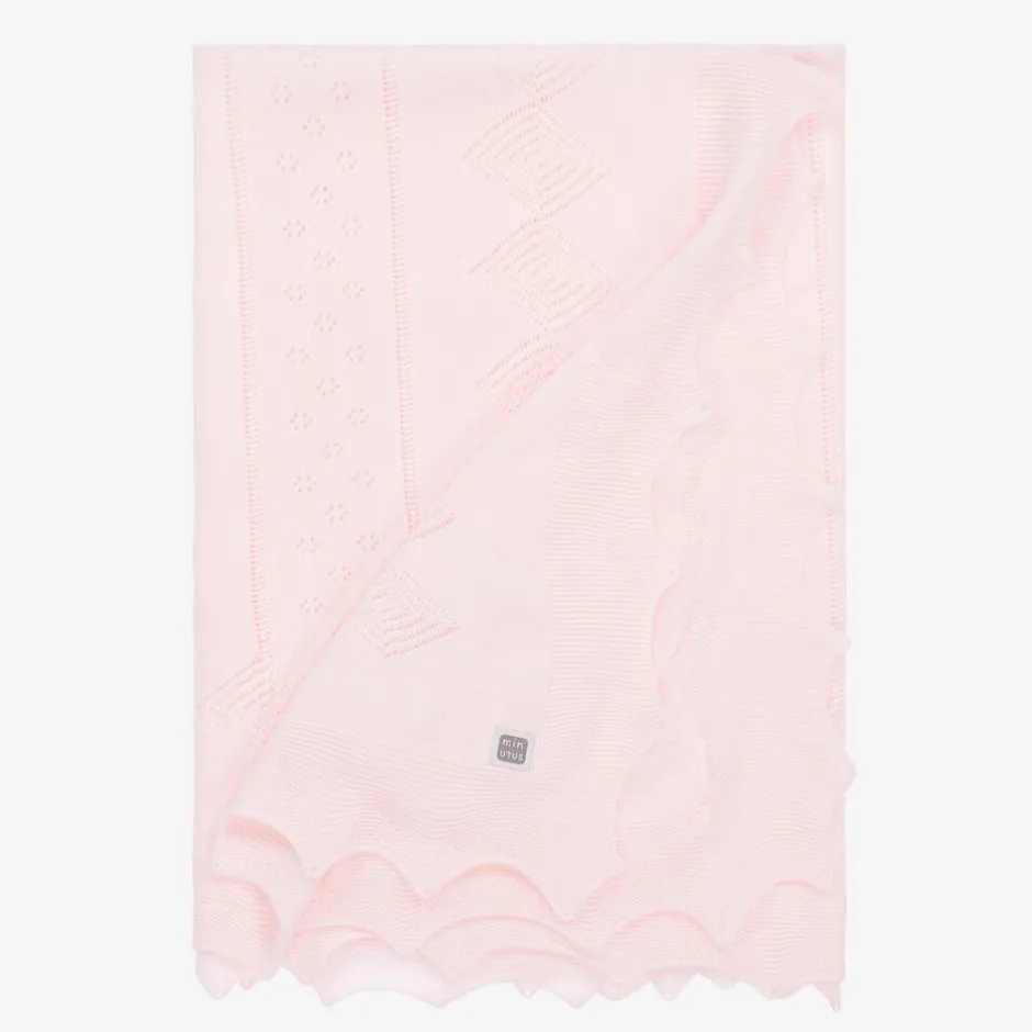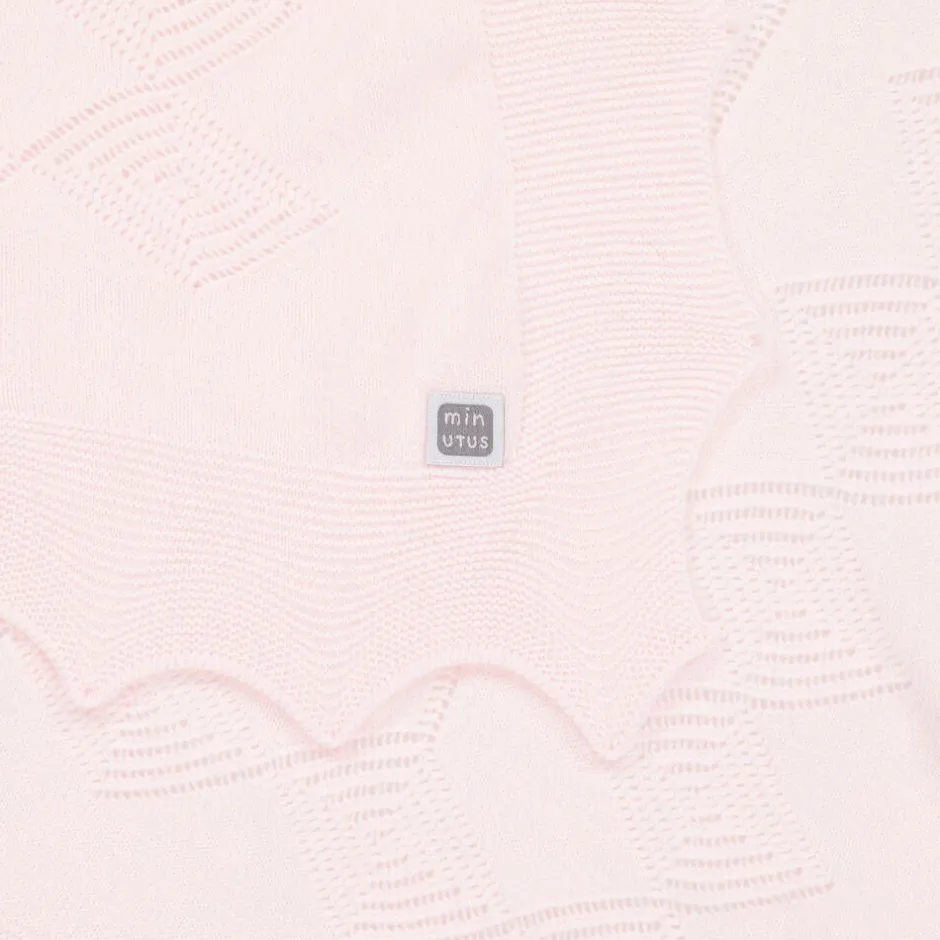 A lightweight pale pink shawl for baby girls by Spanish designer Minutus. Finely knitted with a delicate pattern, it has gently scalloped edges. Lovely for wrapping and presenting baby, it can also be used in the nursery or stroller.