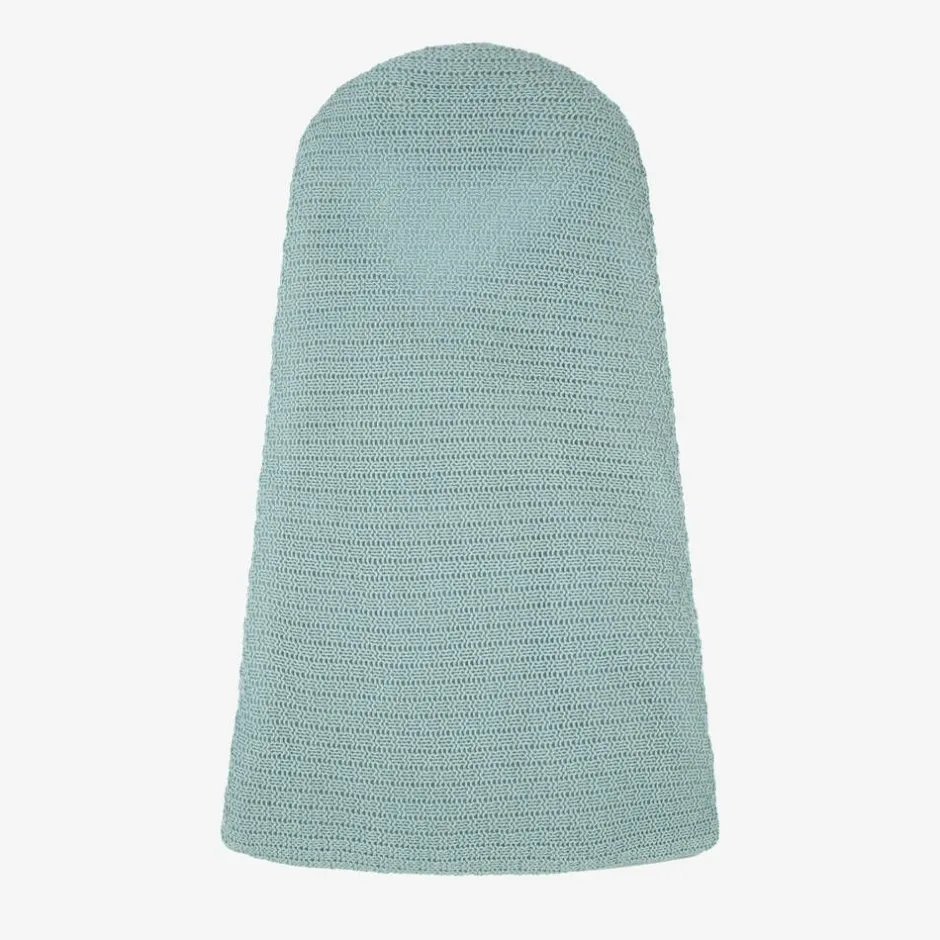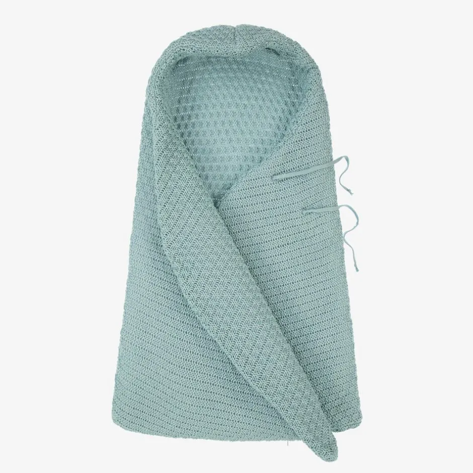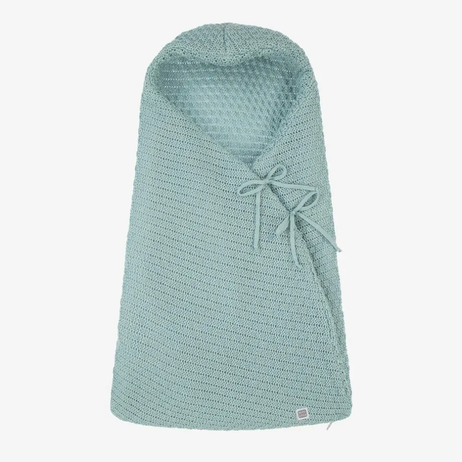 Baby girls and boys green hooded baby nest by Minutus, warmly padded and knitted in soft cotton. In a fold-over style, it has a zip fastening on the bottom and ties on the side. It can be unzipped and laid flat and is ideal for use in the pram or car.