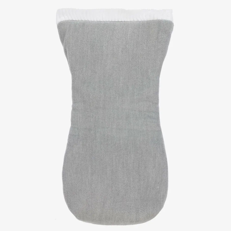 A lovely grey knitted baby nest for boys and girls by Minutus. Beautifully soft and warmly padded, it has a white knitted lining and knitted ruffle trims. There is a concealed front zip fastening, with a small branded tab at the bottom.