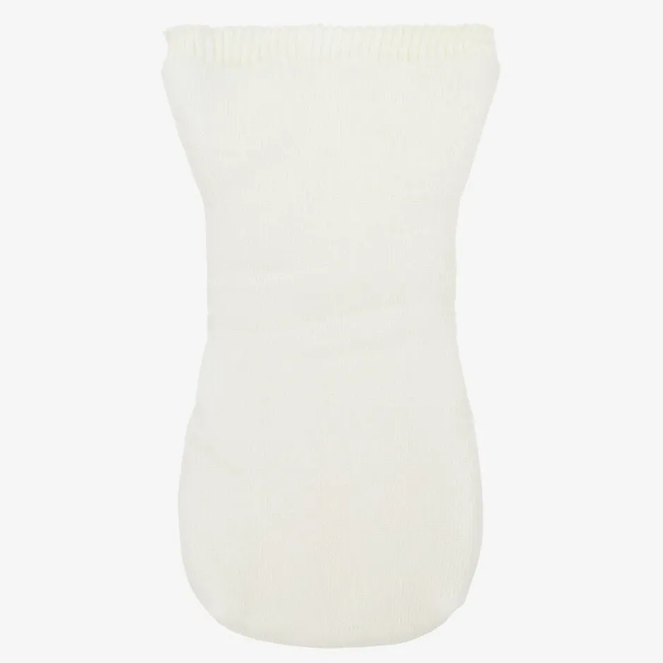 A lovely ivory knitted baby nest for boys and girls by Minutus. Beautifully soft and warmly padded, it has a knitted lining and knitted ruffle trims. There is a concealed front zip fastening, with a small branded tab at the bottom.