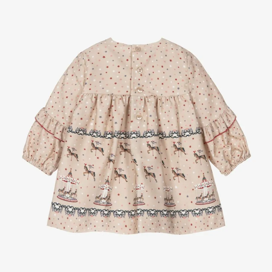 Sweet beige dress for baby girls by Miranda, softly woven in cotton twill. Printed with playful stars and a whimsical carousel pattern, this cute dress has tiered ruffles on the bodice and long sleeves. Glittery red stripes add a touch of sparkle to the look. Lined for comfort against little one's skin, it fastens with classic buttons on the back.