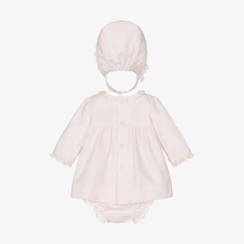 Lovely pink dress set for baby girls by Spanish brand Miranda, made in soft cotton. This traditional outfit comprises a dress with matching knickers and a bonnet. All three pieces have pretty ivory and pink lace and ribbon trims. Lined for comfort, the dress has long sleeves and button fastenings on the back. The bonnet is also lined and has a gently elasticated back. It secures neatly with a button under the chin.