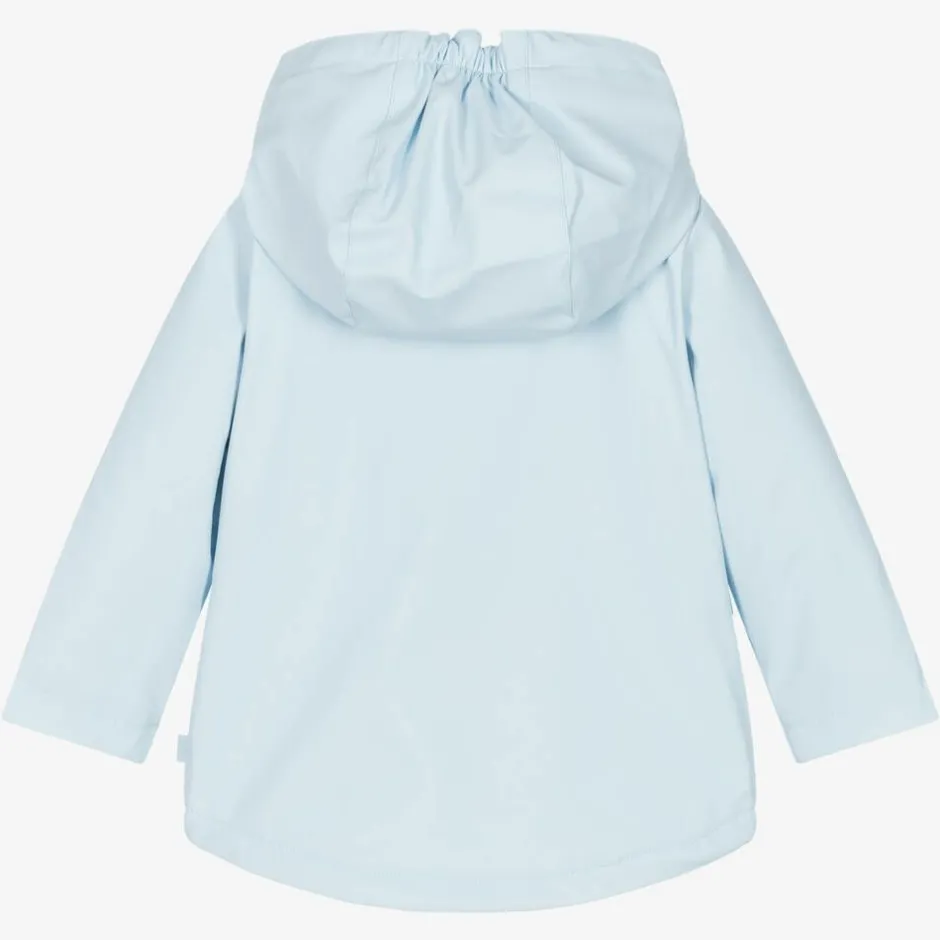 Pale blue hooded coat for younger boys by Mitch & Son, made in a soft and smooth fabric. Lined with a soft fleece, it has a large hood that is elasticated on the top for a snug feel and extra protection against the elements. The zip fastening on the front is concealed under a popper fastening placket and has a useful chin guard. This lovely coat is finished with popper fastening pockets on the front and a rubberised tonal logo patch on the chest.
