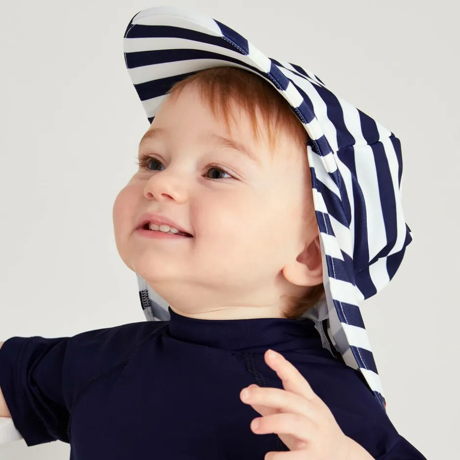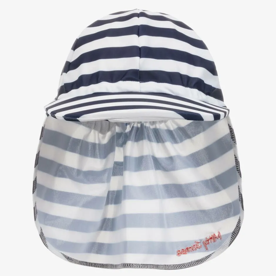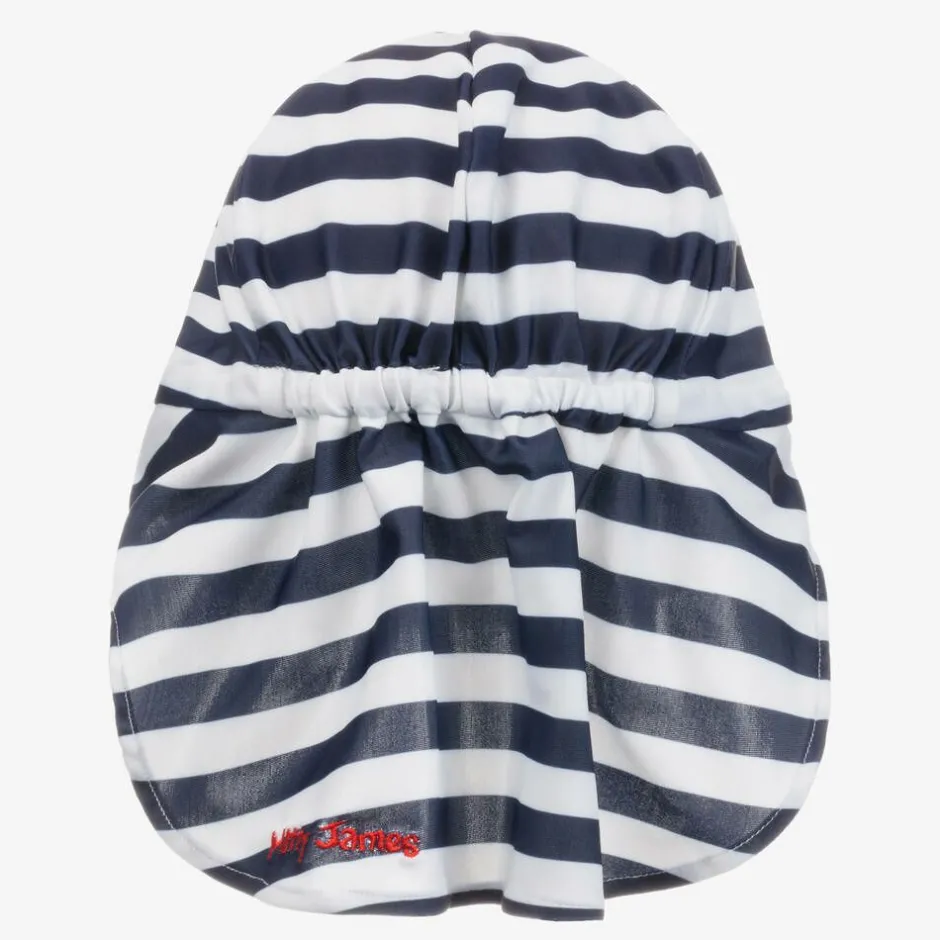 Exclusive to Childrensalon, a navy blue and white striped, sun protective Legionnaire's hat by Mitty James. Ideal for wearing on sunny days on the beach or poolside, it has a peak to shield the eyes and a flap at the back that covers the neck. It is made in super comfortable, stretchy jersey with UPF 50+.