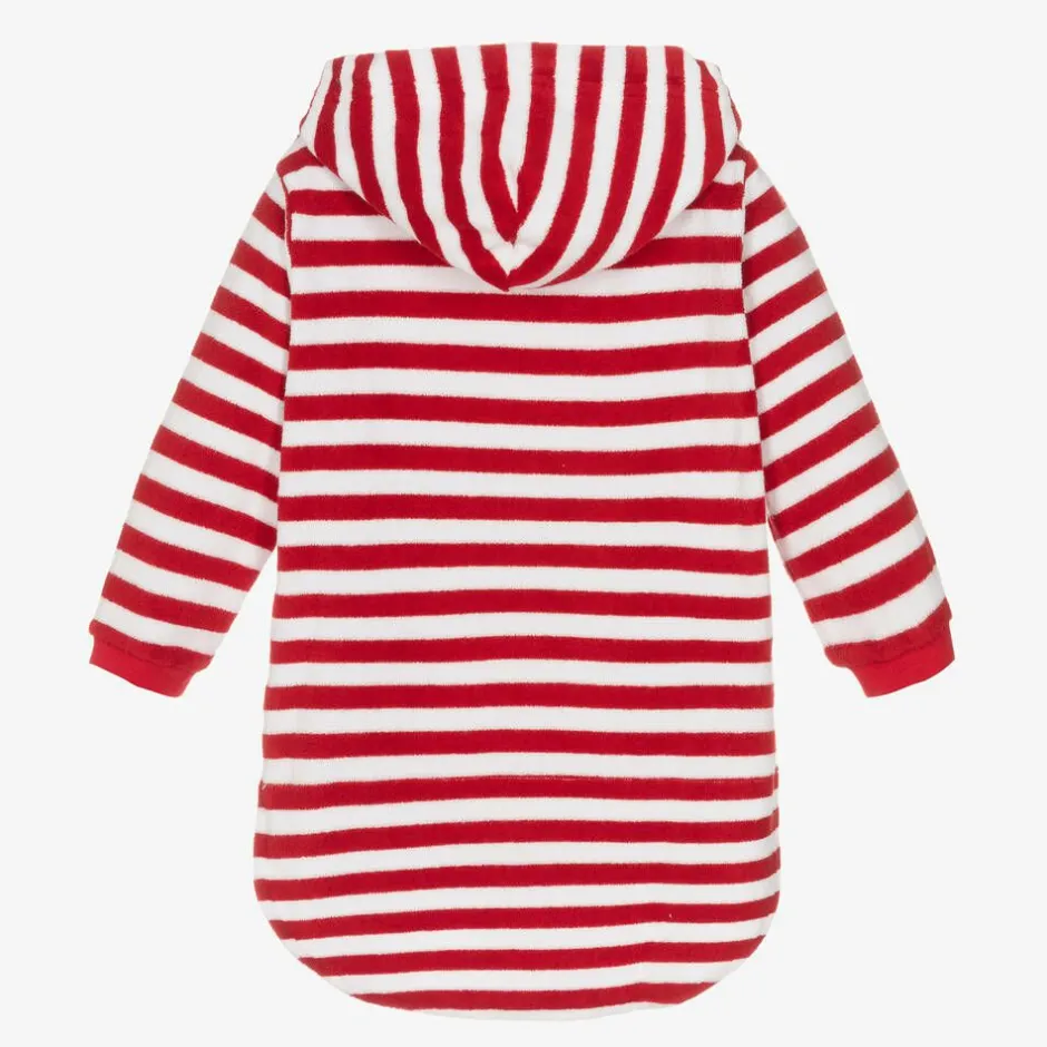 Exclusive to Childrensalon, a red and white striped cotton robe for girls and boys by Mitty James, ideal for the beach or pool. Hooded and soft, it is made in absorbent towelling with a logo patch on the useful pouch pocket. Easy to wear, it is loose-fitting and just right as a comfortable, practical cover-up.
