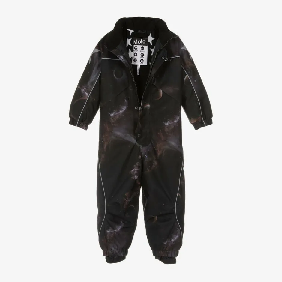Black technical snowsuit for boys by Molo, with a cool outer space print. Made from recycled material, it has a smooth and durable outer shell and warm padding with 3M Thinsulate insulation. Windproof, waterproof and breathable, this snowsuit has an eco-friendly water-repellent coating and taped seams, with a popper fastening storm flap over the front zip to stay warm and dry. It features discreet chest pockets, elasticated gaiters, removable stirrups on the legs, and internal elasticated straps so the suit can be carried hands-free when not in use. There is a removable hood with a soft polar fleece lining for comfort, and light reflective details for added safety.