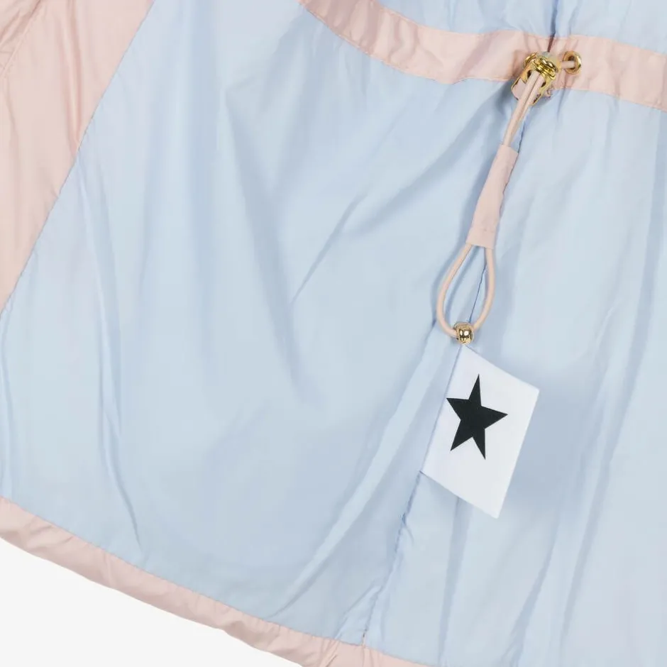 Silky pale pink puffer jacket for girls by Danish brand Molo, with a colourful butterfly print on the back. With cosy, mid-weight, technical down padding, it has a velcro-secured hood concealed in the stand-up collar, as well as elasticated cuffs to keep the chilly weather out. There is an internal, drawstring waistband for a great fit and useful, concealed side seam pockets. The front zip fastening has a protective chin guard, and a golden, branded pull tab. The jacket is lined in lightweight, blue satin for comfort.