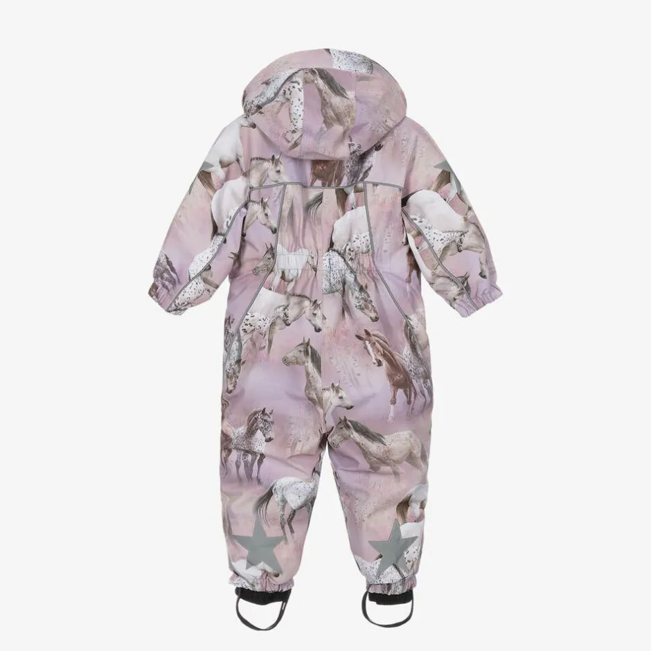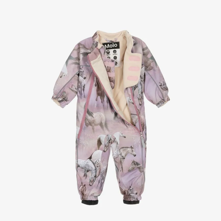Lilac pink horse print technical snowsuit for little girls by Molo, made with recycled materials. It offers warmth in conditions as low as -25°C thanks to its technical padding, polar fleece lining and waterproof, windproof and breathable features. It is designed with a knitted panel and zip guards below the chin to prevent rubbing. The removable hood has a detachable faux fur trim, secured with poppers. There are reflective trims for safety and two practical front zips with a velcro-closing panel beneath. The elasticated cuffs have inner snow gaiters and removable rubber stirrups with buttons, to fit comfortably in snow boots.