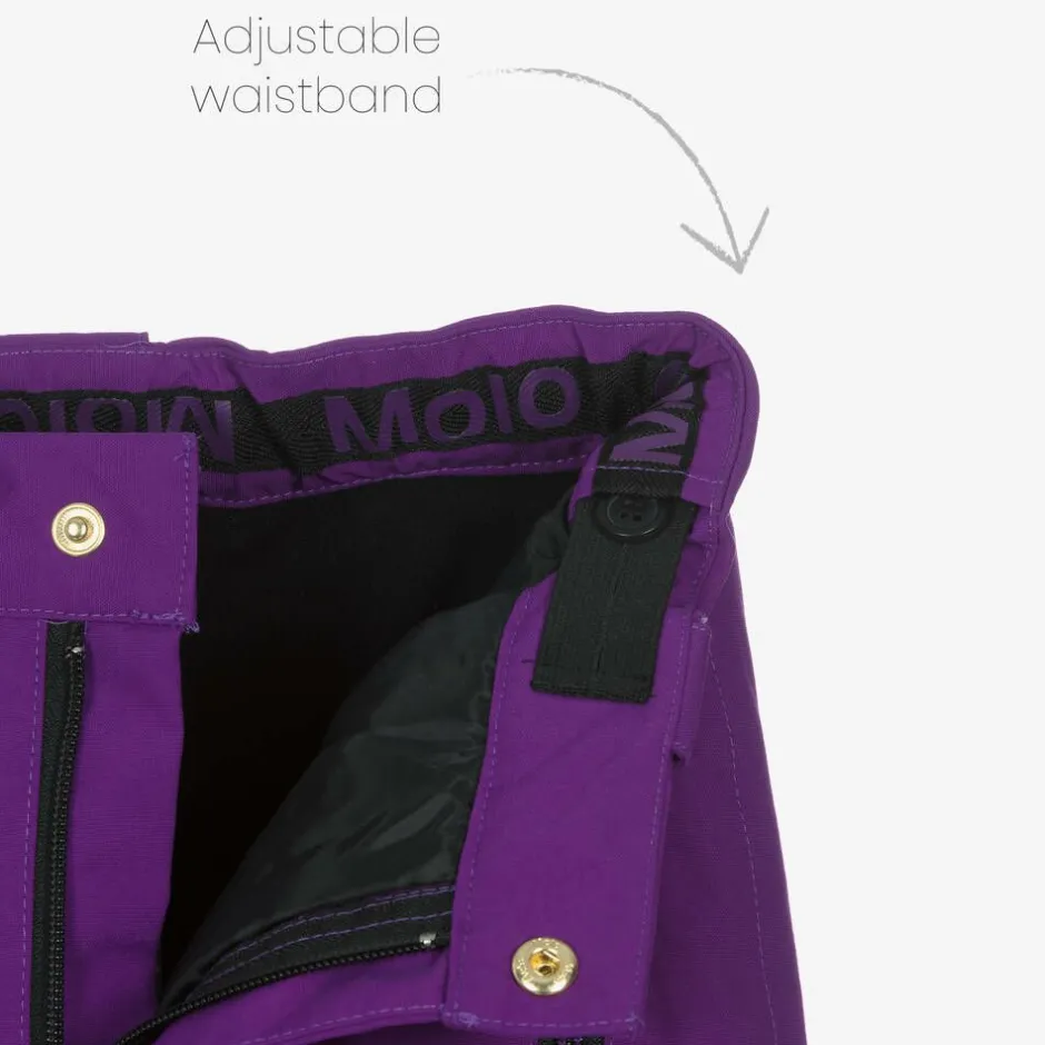 Padded purple ski trousers by Molo, ideal for keeping girls dry, warm and visible on the slopes. Made in smooth, durable fabric from recycled materials, these breathable trousers have lightweight insulation and are lined in cosy fleece and satin, with taped seams. They have velcro cuffs with elasticated, popper-fastening internal gaiters and removable rubber stirrups. The waistband is adjustable for a great fit and has velcro-fastening belt loops. There is reflective detailing on one leg for visibility.