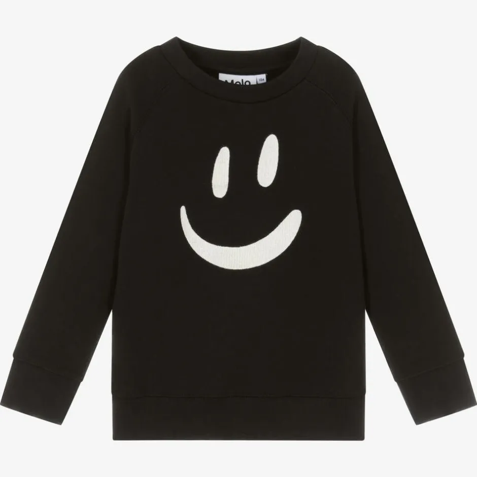 Fun black sweatshirt for boys and girls by Molo, made in soft organic cotton jersey. On the front, there is a happy, smiling face embroidered on the front. This casual sweatshirt has lightly ribbed trims, raglan-style long sleeves, and a fleecy inside for extra cosiness.
