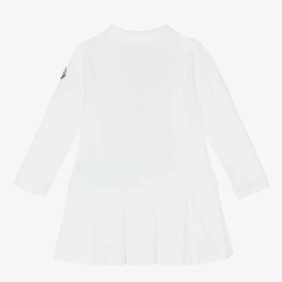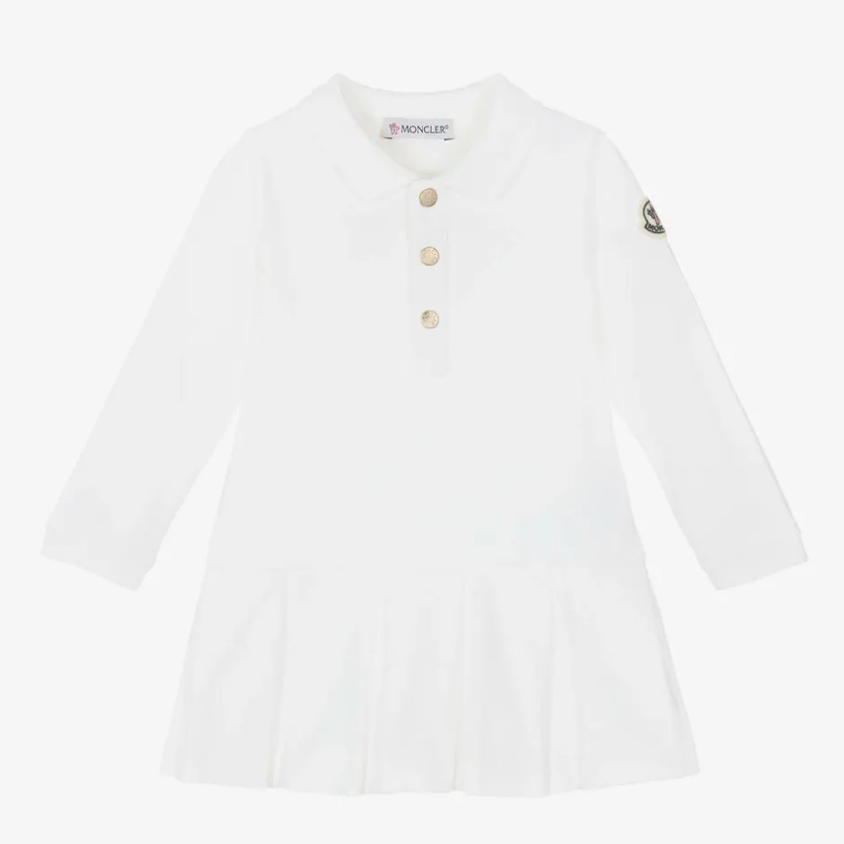 A lovely ivory polo dress for baby girls by luxury brand Moncler Enfant. Made in soft and comfortable cotton piqué, it has a dropped waist and a sweet pleated skirt. The signature felt patch is stitched on one of the long sleeves and there are embossed gold popper fastenings on the front.