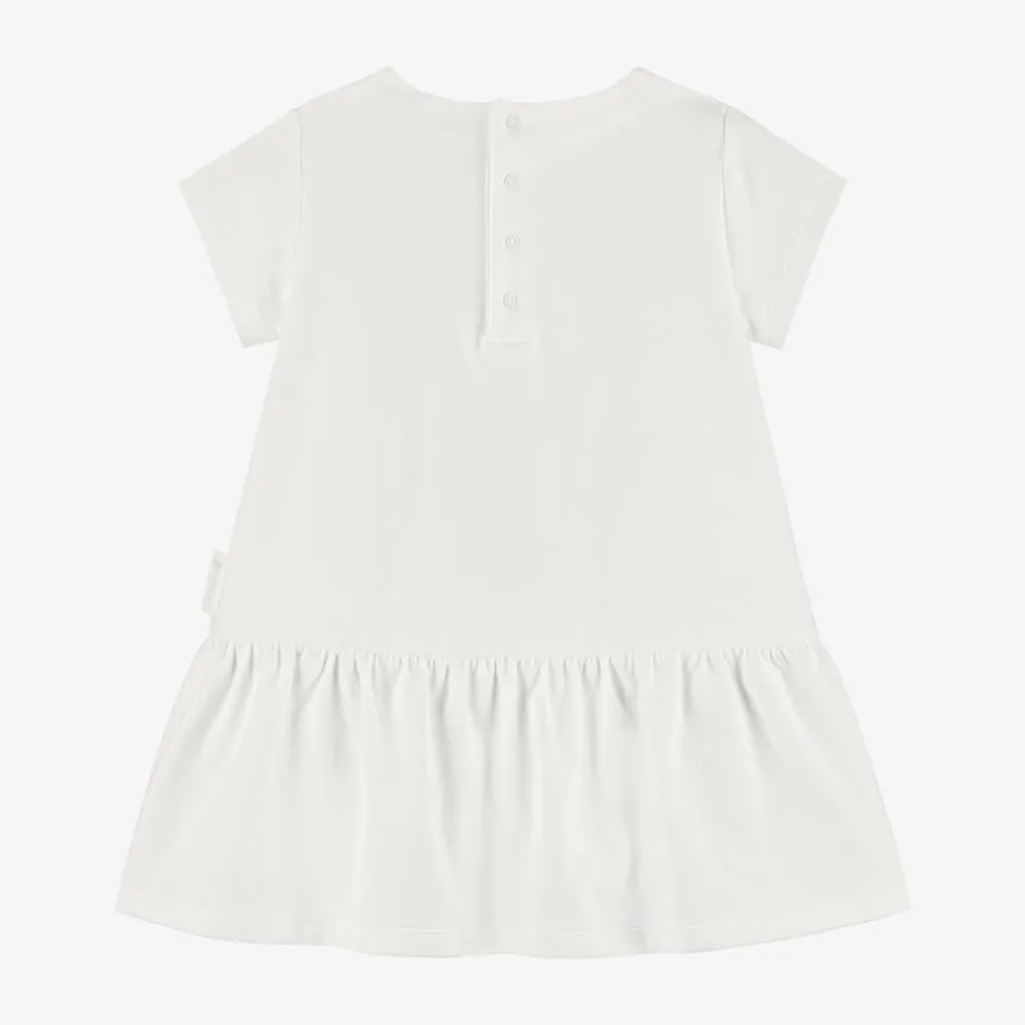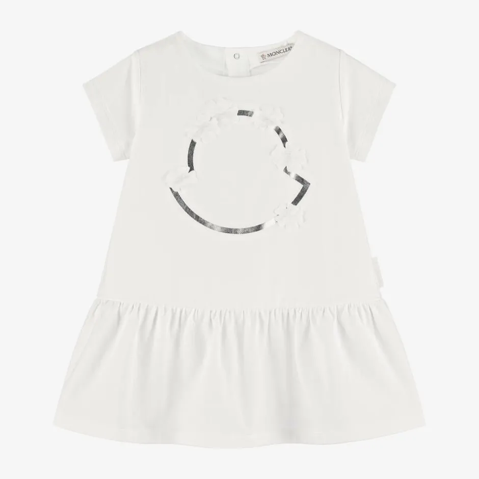 White cotton jersey dress for baby girls by luxury brand, Moncler Enfant. Soft and stretchy, the front has a silver logo outline and floral appliqué motif. There are popper fastenings on the back for easy dressing.