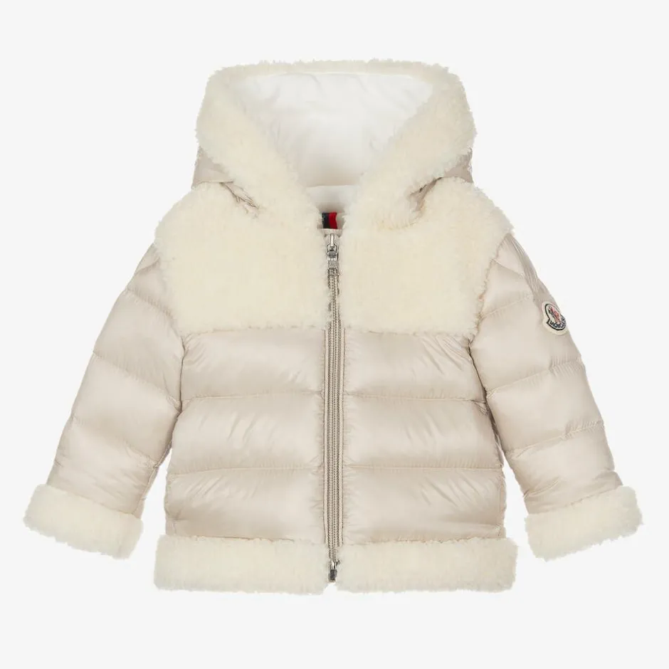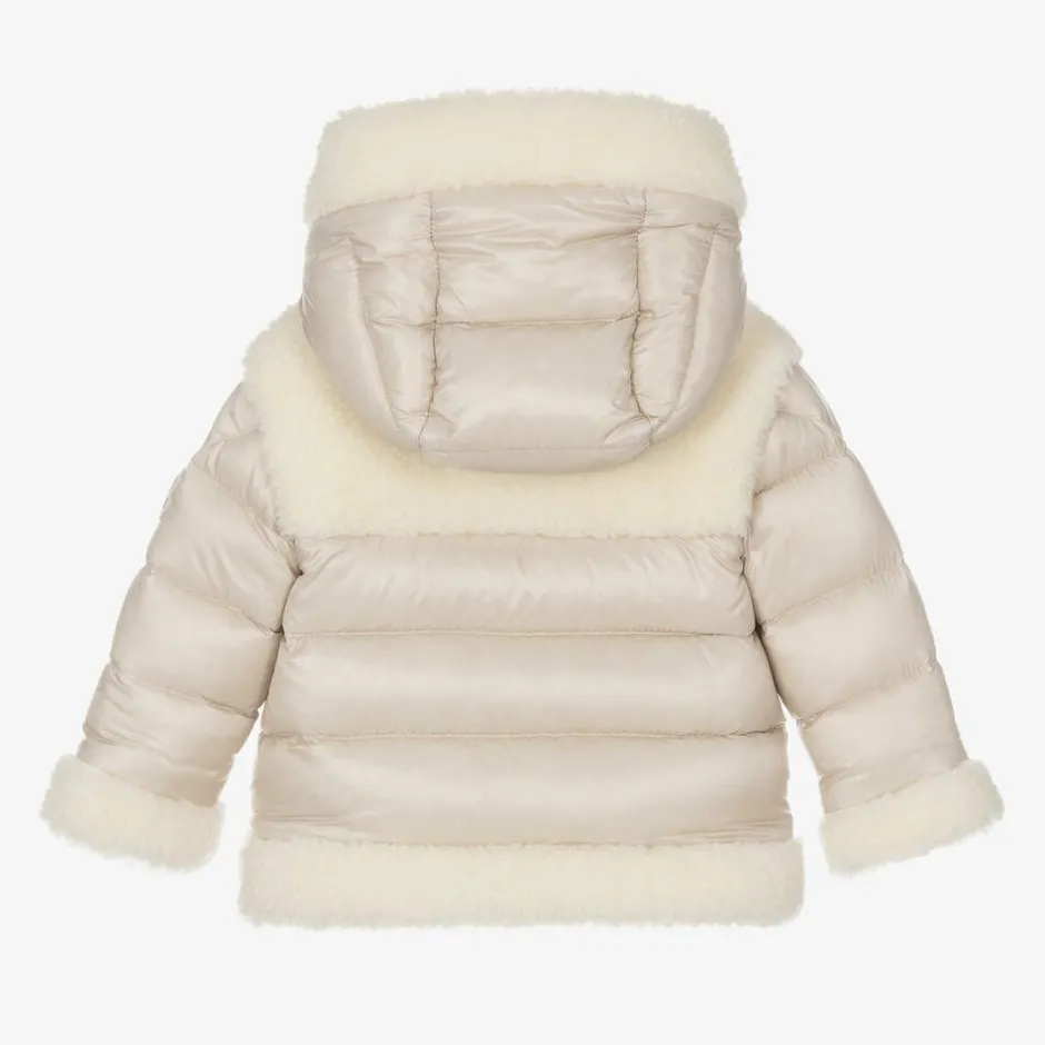 Lovely light beige hooded puffer jacket for little boys and girls by luxury brand Moncler Enfant, trimmed with ivory sherpa fleece. Made in the signature recycled longue saison, it has a silky water-repellent finish and down padding for lightweight warmth. Lined in soft cotton jersey for comfort, it fastens with a front zip and has side seam pockets secured with poppers. The iconic felt logo patch can be seen on one sleeve for an unmistakable look.