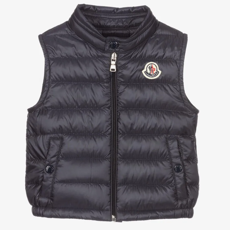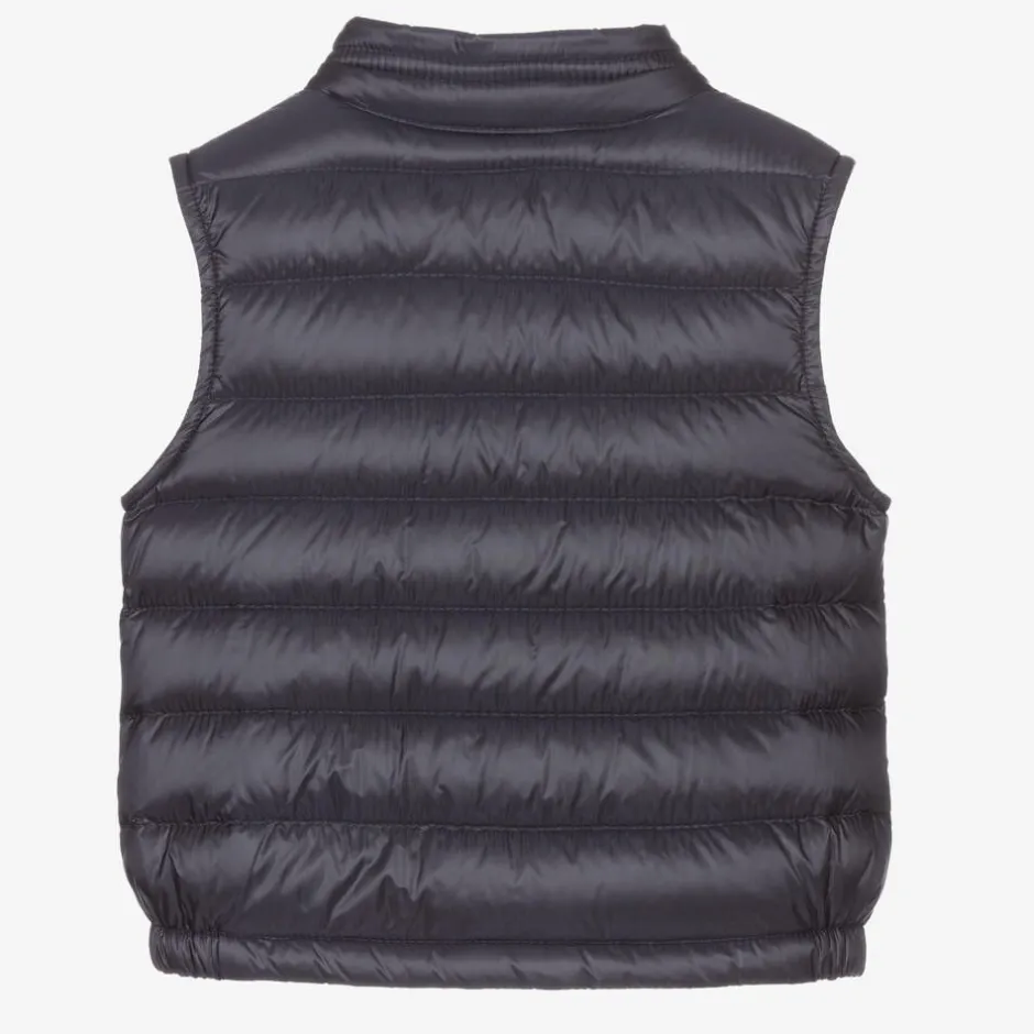 Navy blue puffer gilet for little boys and girls by luxury French designer, Moncler Enfant. Luxuriously padded in ultra-warm down, this sleeveless jacket has the brand's iconic felt logo patch on the chest for an instantly recognisable look. Soft and silky, it has a logo-embossed zip, popper fastenings and an elasticated trim to keep out cold chills.