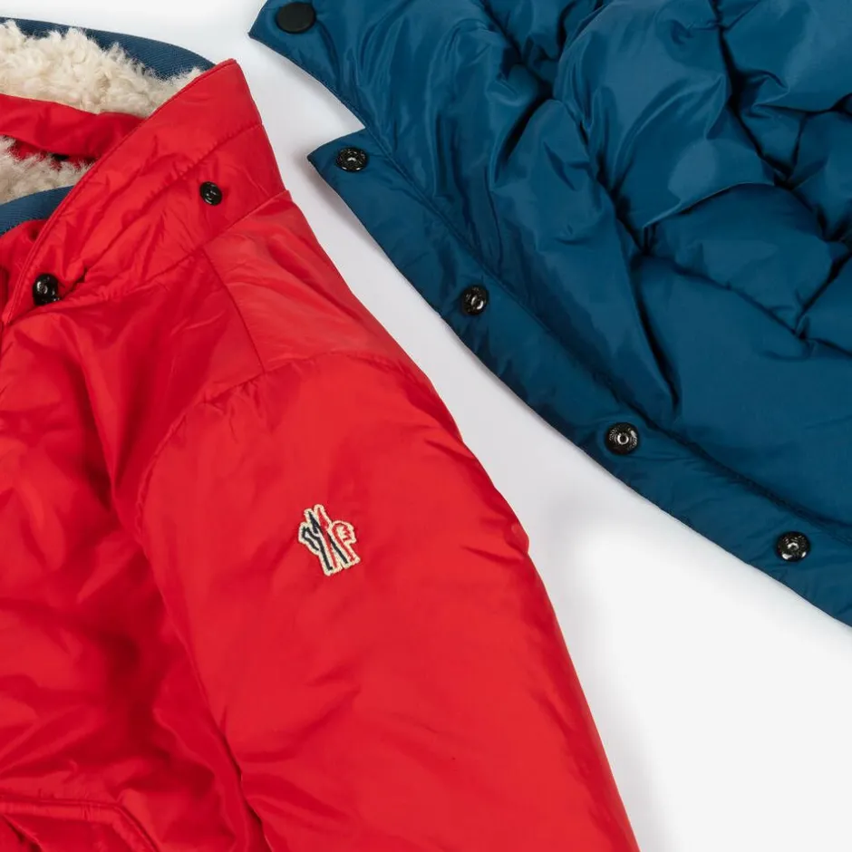 Keep cosy and warm in this super stylish reversible jacket for boys by Moncler Enfant, from the brand's Grenoble après-ski collection. The beige side is made in beautifully soft teddy fleece, with a branded patch on the front. The red side is in silky smooth nylon and has signature logo embroidery on the chest. Luxuriously padded in soft down, the jacket fastens with a zip and poppers down the front and has a detachable puffer hood. Both sides have contrasting blue trims and useful popper fastening pockets.