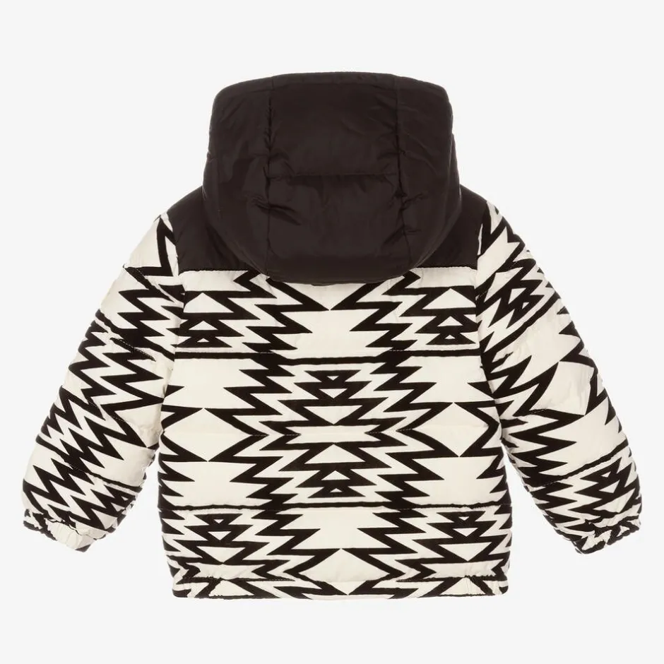 Ivory and black with a zigzag pattern, this puffer jacket for little boys is by luxury French brand Moncler Enfant. Lined in comfortable cotton jersey and padded in warm yet lightweight down, it has a fixed hood and hand pockets which fasten with concealed poppers. The designer's iconic felt logo is on one sleeve, and the logo-embossed zip puller on the front adds a statement finish. The hem and cuffs are elasticated to help insulate against chilly winds.