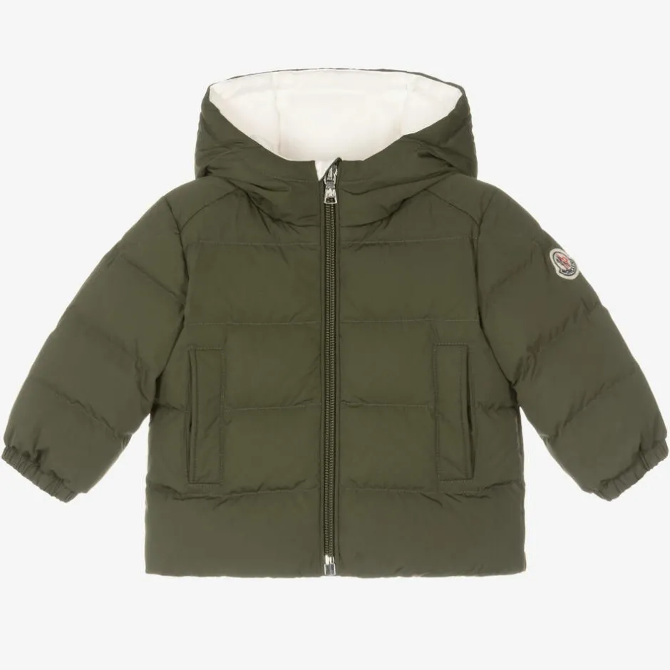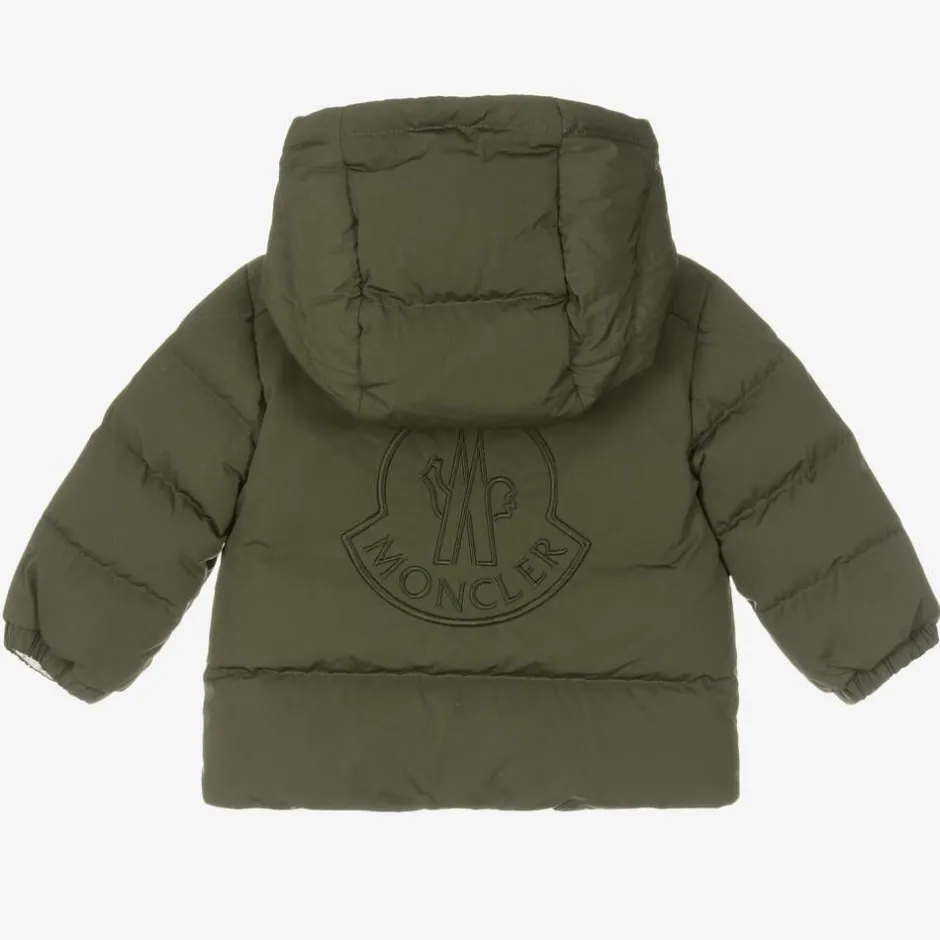 Khaki green hooded puffer jacket for little boys by luxury brand Moncler Enfant, made in a silky soft fabric. This water-repellent jacket is warmly padded with soft down and has elasticated cuffs to help keep out chilly winds. It has a fixed hood, an exposed front zip fastening, and popper fastening front pockets. For that unmistakable designer look, the coat has a large embroidered logo on the back and the signature logo patch on one sleeve.