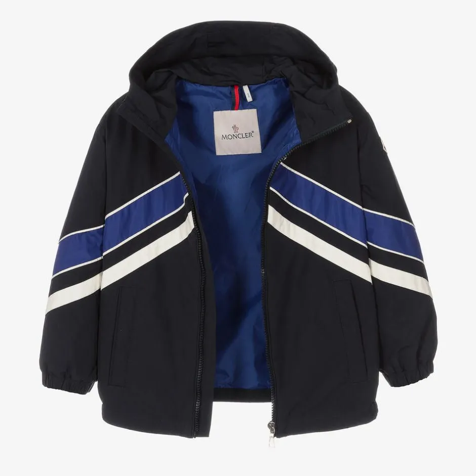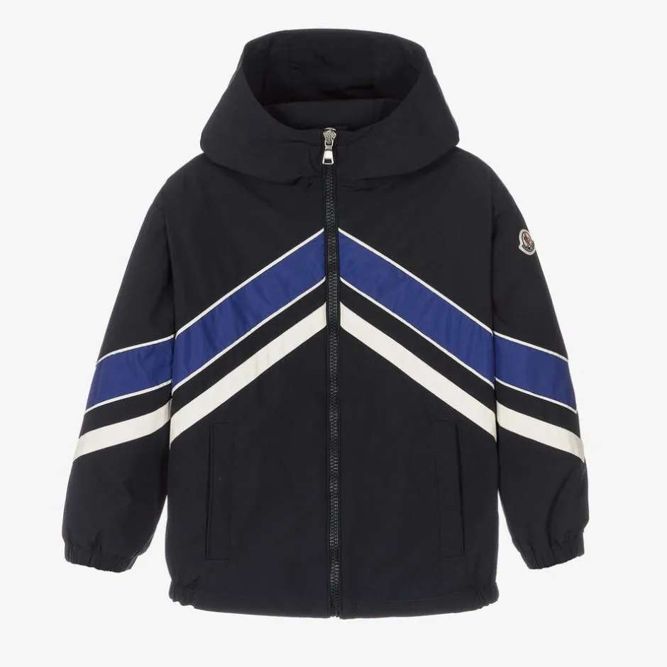 Boys dark navy blue jacket by luxury brand Moncelr Enfant, with a sporty blue and white chevron design and the brand's signature logo patch on one sleeve. Stylish and practical this water-repellent jacket is crafted from micro soft nylon, with a comfortable silky lining and elasticated trims. There are two front pockets for everyday essentials and a small hood for keeping dry on rainy days.