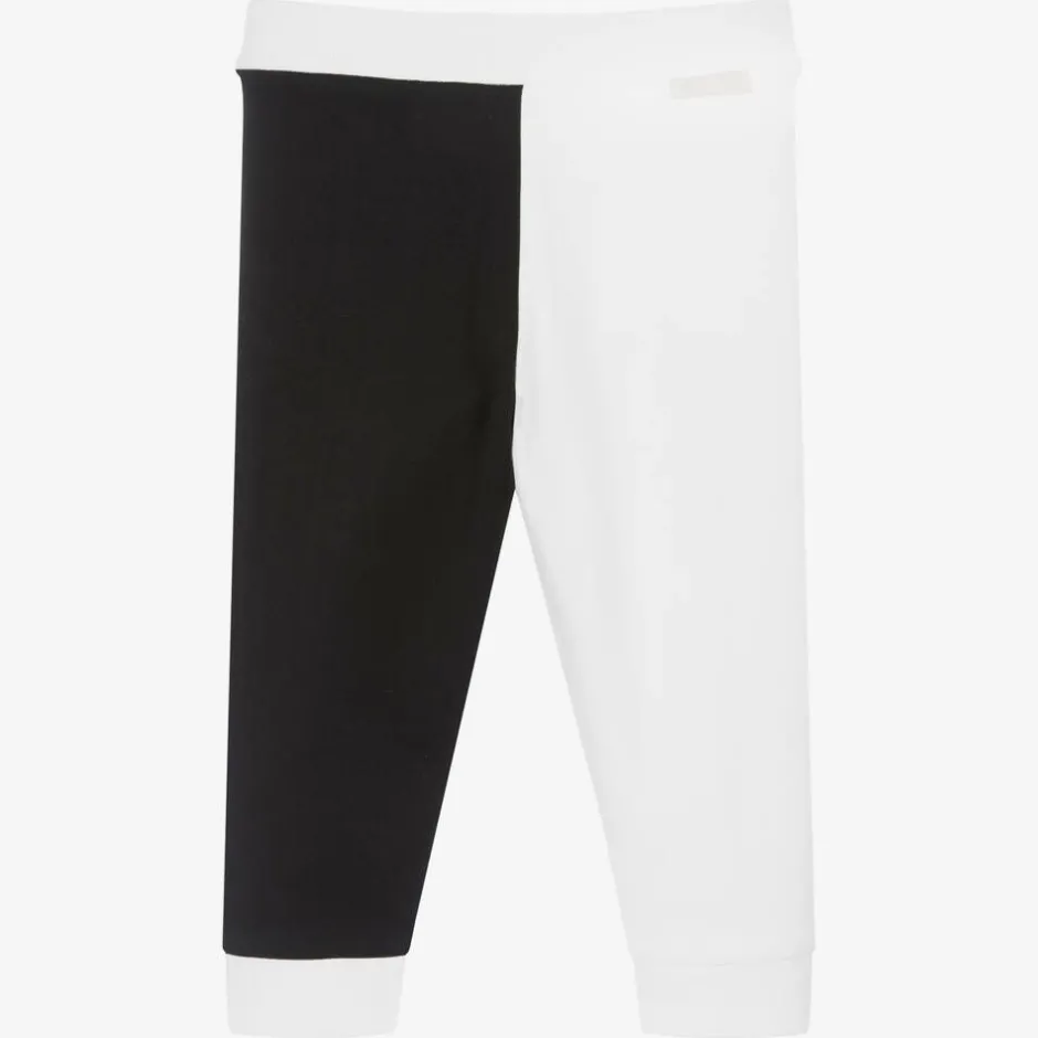 Little boys white and black joggers from luxury designer Moncler Enfant. This monochromatic design is crafted in stretchy, mid-weight cotton jersey with softly ribbed cuffs. They have black and white asymmetric front panels with split rubber logo lettering. The French label's logo tab is stitched on the back below the comfortable elasticated waist.