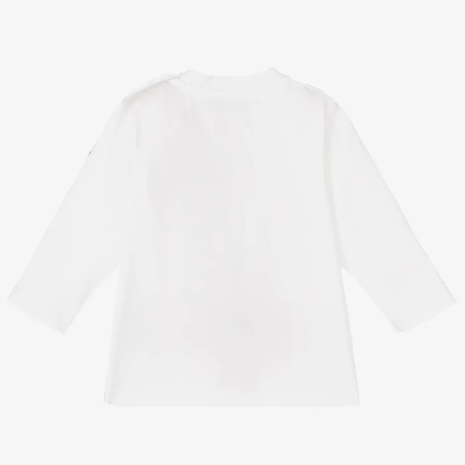 Boys white cotton long sleeved logo top by luxury brand Moncler Enfant, printed with a colourful logo print on the chest. Made in soft, comfortable cotton jersey, this casual top has a small crew neckline and useful branded popper fastenings on one shoulder. The brand's signature logo patch is appliquéd on one sleeve, for an added designer touch.