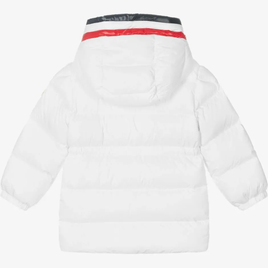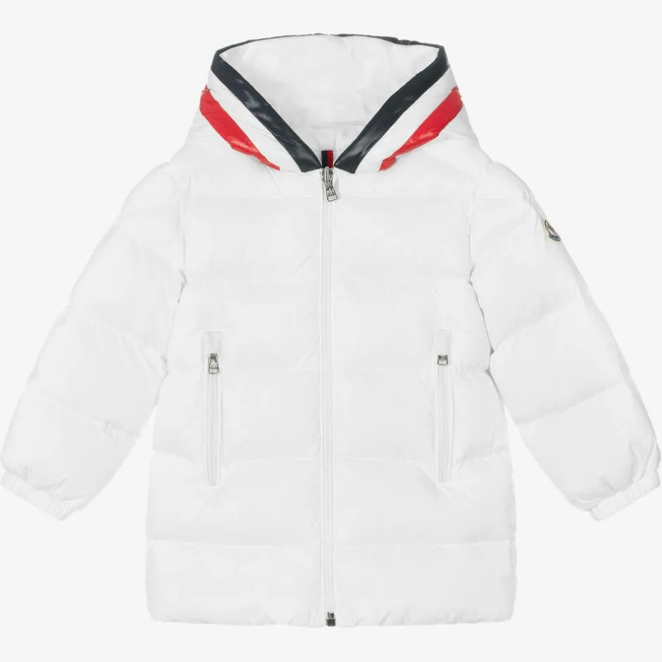 Little boys white down padded coat by luxury brand Moncler Enfant. Branded with the signature navy blue white and red stripes on the hood, it also has the iconic logo patch on one sleeve. This smooth, water repellent coat has a soft cotton jersey lining for comfort and fastens with a zip on the front and pockets.