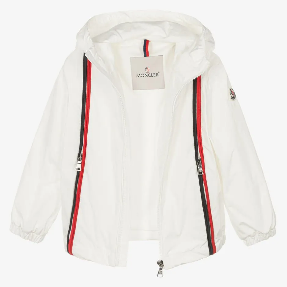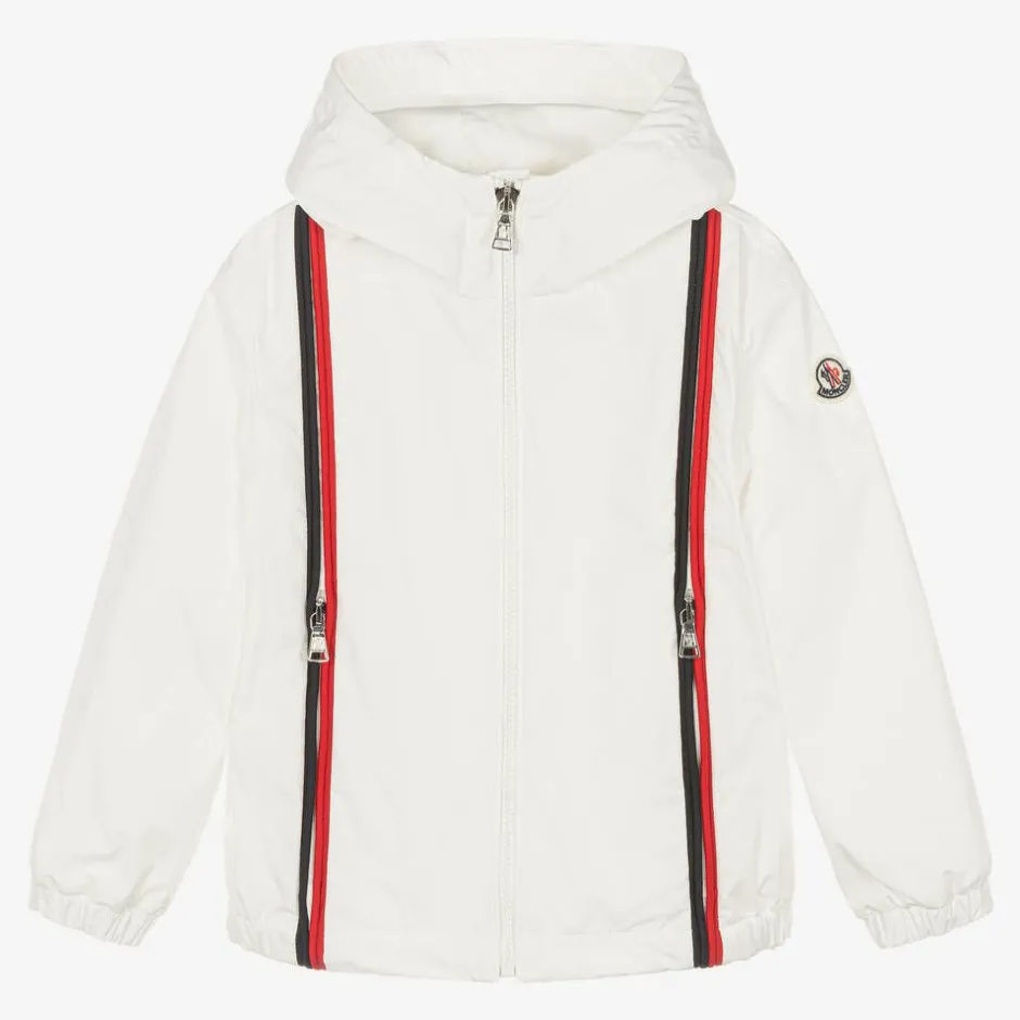 Bright white windbreaker jacket for boys by Moncler Enfant. With a smooth outer fabric, this zip-up style has a soft cotton jersey lining, a fixed hood, zipped hand pockets and elasticated cuffs and hem. There are sporty blue and red vertical stripes down the front and a logo patch on one sleeve.