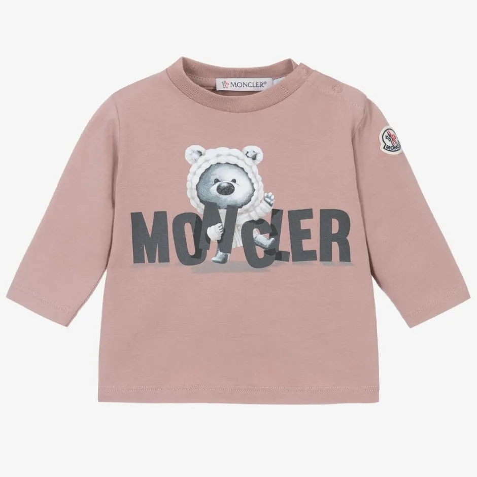 Dusky pink top for little boys and girls by luxury brand Moncler Enfant, made from soft and stretchy cotton jersey. Symbolic of the brand, this signature piece has a bold logo print on the front, along with a friendly bear motif. The iconic felt logo patch can be seen on one sleeve for added identity. All sizes have popper fastenings on one shoulder to help with over-the-head dressing.
