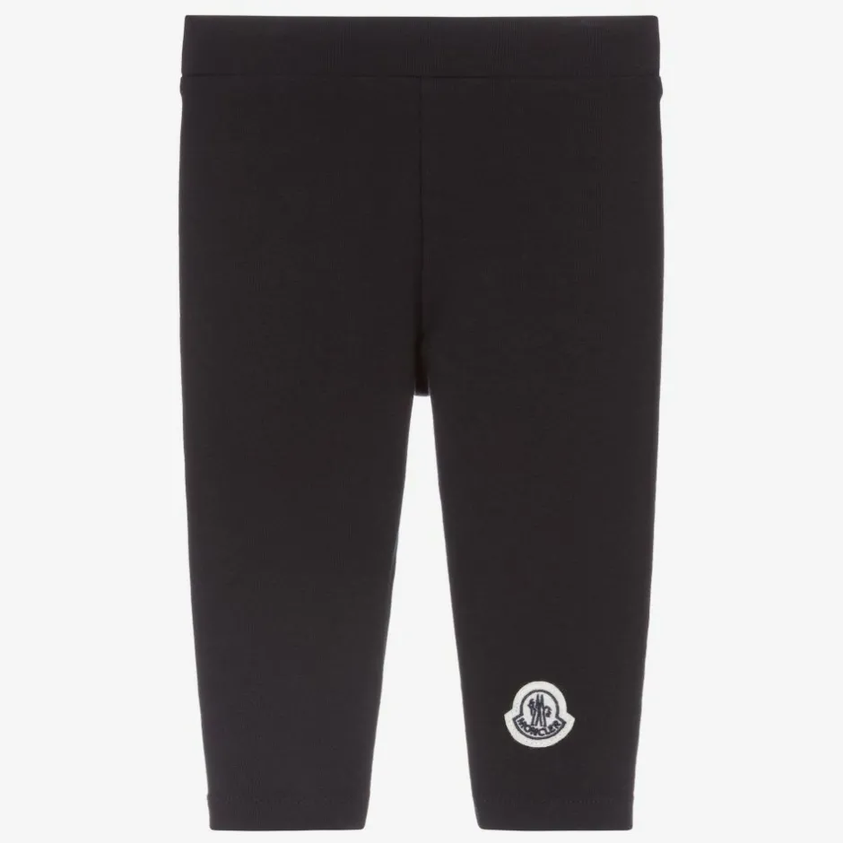 Navy blue leggings for little girls by French luxury designer Moncler Enfant. Made in comfortable cotton jersey, they have the iconic felted Moncler logo badge on one leg in ivory, navy blue and red.