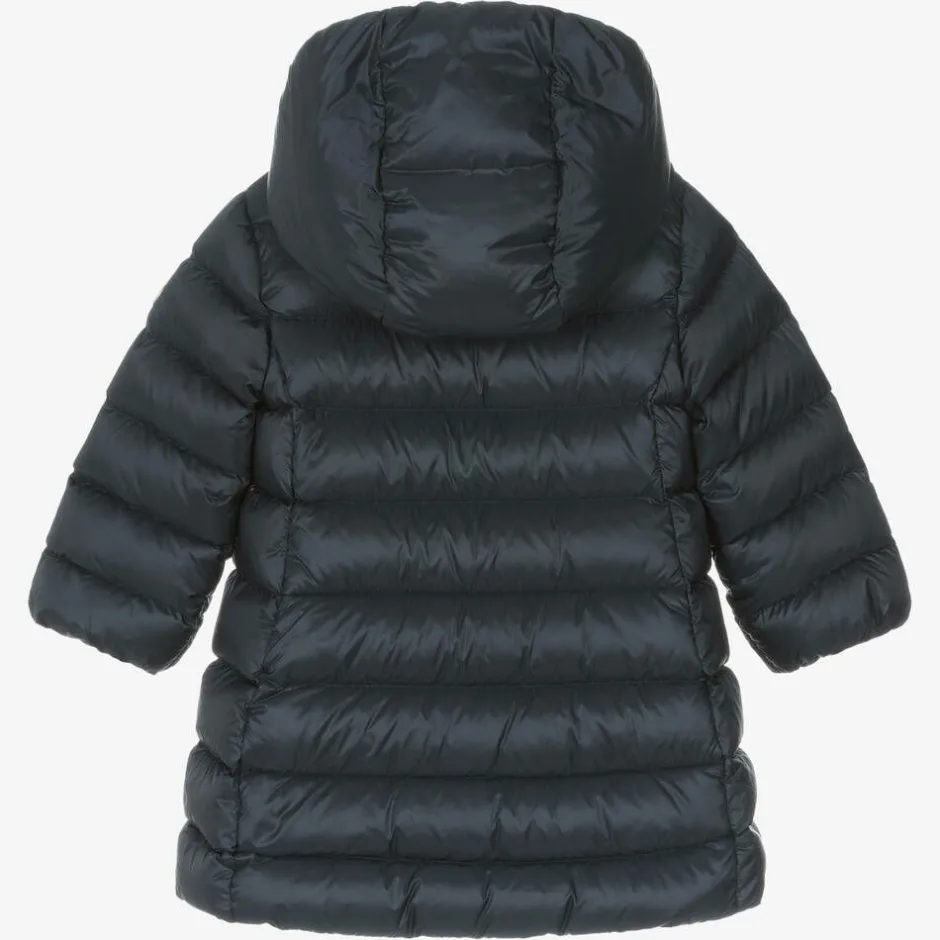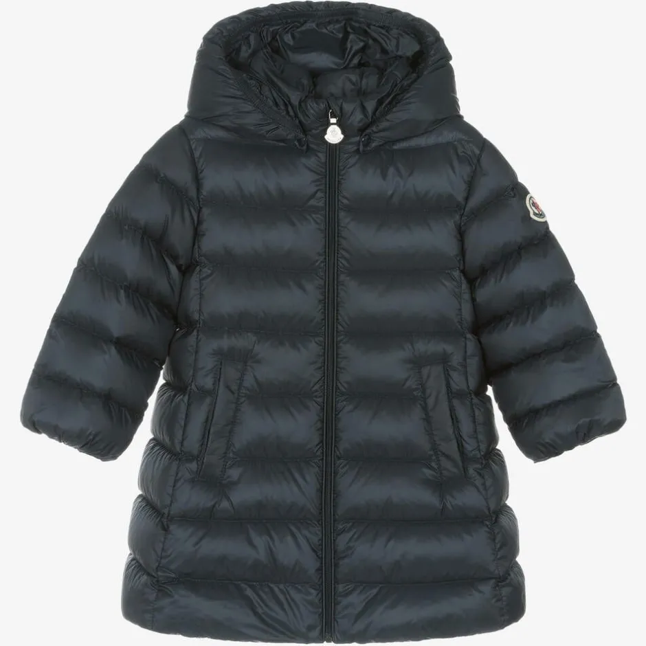 Stylish navy blue puffer coat for little girls by Moncler Enfant, padded with luxuriously warm down. In a gorgeous flared shape, this water repellent coat has popper-fastening hand pockets on the front and an easy-to-use front zip fastening. The instantly recognisable felt logo badge is stitched on one sleeve for a branded look. The cuffs have elasticated trims to keep out cold chills, and the hood is detachable for versatile wear.