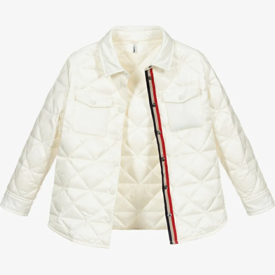 Girls lightly down padded ivory quilted jacket by French luxury brand Moncler Enfant. It has red, blue and sparkly gold trims on the side seams and popper fastenings, along with the brand's iconic logo appliqué on the sleeve. There are also two pockets on the front and a lightweight, detachable hood.