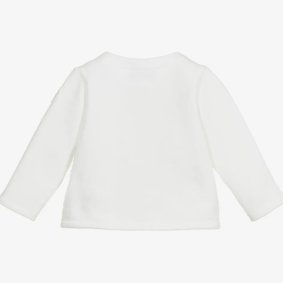 Little girls ivory zip-up top by luxury French brand Moncler Enfant. It is made of a soft and stretchy cotton sweatshirt jersey, with a warm, down padded puffer style front. It has a front zip fastening concealed with a logo printed red rubber strip on each side.
