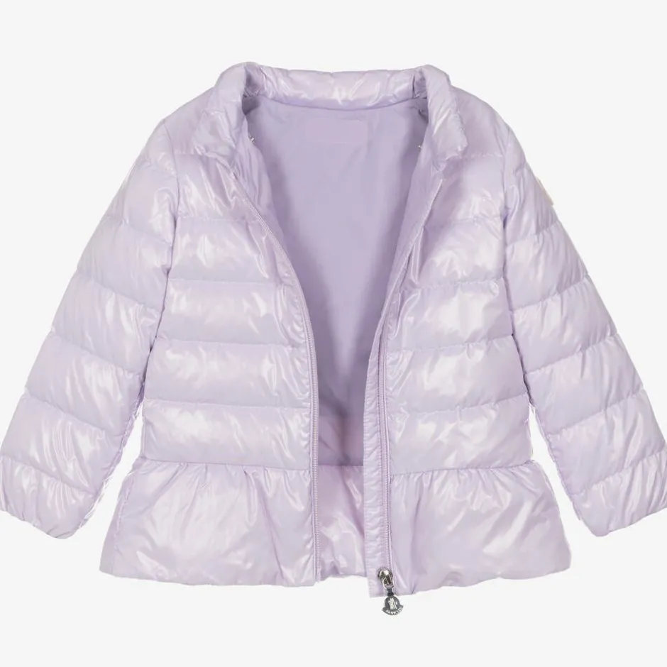 Pretty lilac purple jacket for little girls by luxury brand, Moncler Enfant. Padded with down for lightweight warmth, this cute jacket has a girly, peplum style hem and elasticated sleeves to keep out cold chills. It easily fastens with a smooth zip on the front, and has a versatile, pack-away hood on the back of the neck. Signing off the style with a branded stamp, it has the iconic felt logo badge on one sleeve.