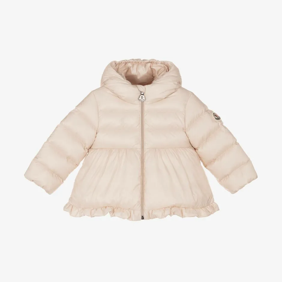 Blush pink coat for little girls by luxury designer, Moncler Enfant. Padded with down for warmth, this water-repellent coat has the iconic felt logo badge on one sleeve and a cute peplum hem. It is made with Moncler's signature longue saison fabric from recycled materials and fastens smoothly with a zip on the front. The elasticated hood is designed to keep out cold chills.