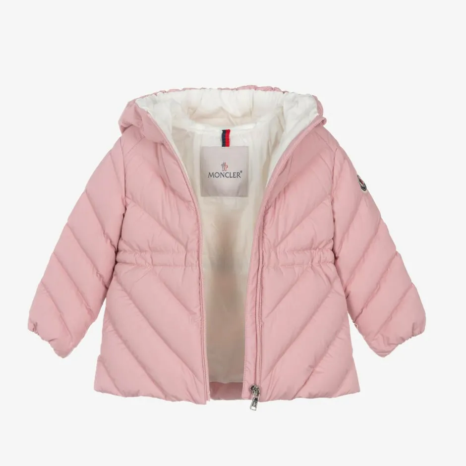 A pale pink puffer coat for little girls by Moncler Enfant, with lovely diagonal quilting. Made in a matte finish with a water-repellent coating, it is luxuriously down-padded for warmth without the weight. It is designed with a gently elasticated waist for a fit and flare shape. It has a jersey-lined hood, elasticated cuffs and the iconic felted logo patch on the sleeve. A practical zip fastens on the front and concealed side seam pockets both secure with poppers.