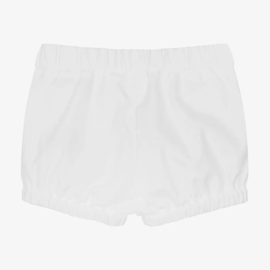 White cotton shorts for little girls by luxury brand Moncler Enfant, made in lightweight poplin. Elasticated on the legs, these simply styled shorts are defined with the signature felt logo patch above the hem. They have hidden side seam pockets and inverted pleats on the front for shaping. The elasticated waist makes them comfortable to wear and easy to slip on and off.