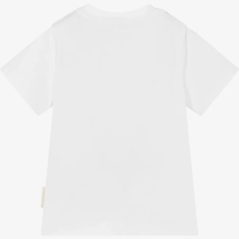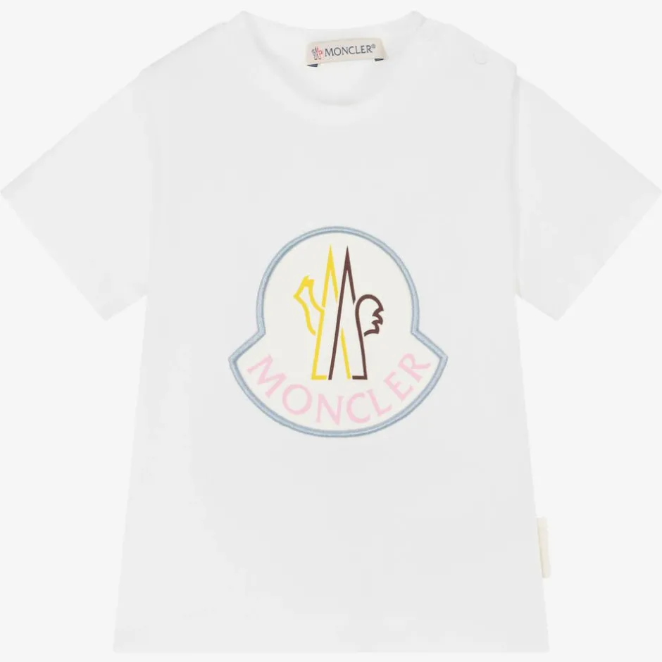 Super cute white T-shirt for little girls by French luxury brand Moncler Enfant, made in comfortable cotton jersey. Fastening with shoulder poppers, it has the brand's unmistakable logo on the front with a blue embroidered outline and colourful lettering within.