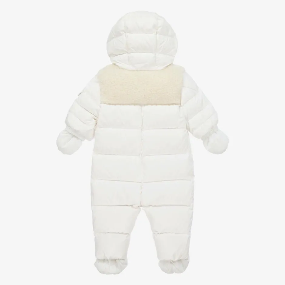 Ivory hooded snowsuit for baby boys and girls by luxury brand Moncler Enfant, made with recycled materials. Silky smooth, it is made in a matte fabric that is both water repellent and breathable and has a beautifully soft cotton jersey lining. It is down-padded for superior warmth and comfort and fastens with a branded zip fastening on the front. The detachable mittens and booties easily attach with poppers. Soft, ivory teddy fleece across the shoulders adds a stylish touch. One sleeve has a patch pocket, accented with a branded popper and the instantly recognisable felt logo patch.