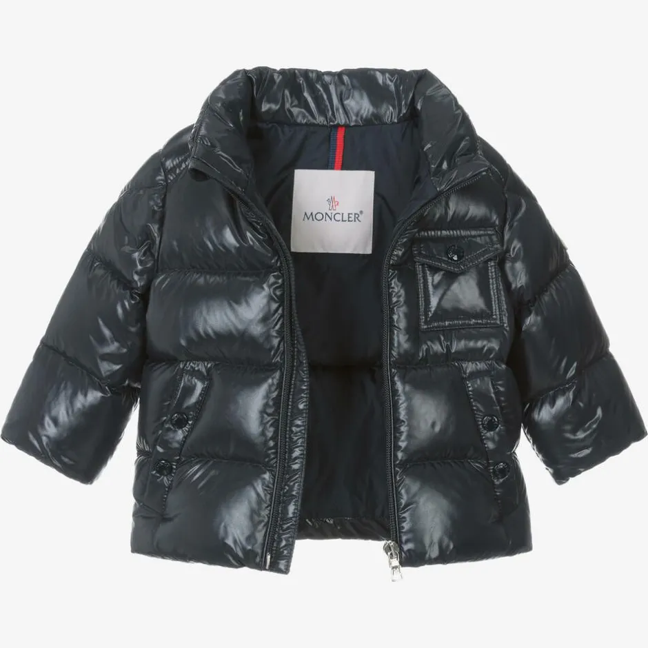 Navy blue zip-up puffer jacket for little boys and girls by luxury brand Moncler Enfant. Luxuriously down padded, it is made in silky smooth nylon laquƩ with a shiny water-repellent finish and has elasticated cuffs to keep the warmth in. Stylish yet cosy, it features a detachable hood with removable faux fur trim, three front pockets with branded poppers, and the iconic felt logo patch appliquƩd on one sleeve.