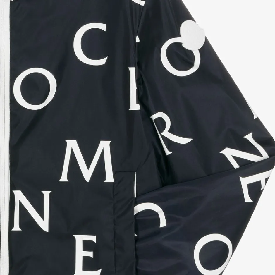 Teen boys navy blue zip-up windbreaker jacket by luxury brand Moncler Enfant. Smooth and lightweight, it has a white logo-letter pattern and a white silicone logo patch on one sleeve. The ivory hood is lined for comfort and has soft elasticated trim to match the sleeve cuffs. There are popper fastening pockets on the front.