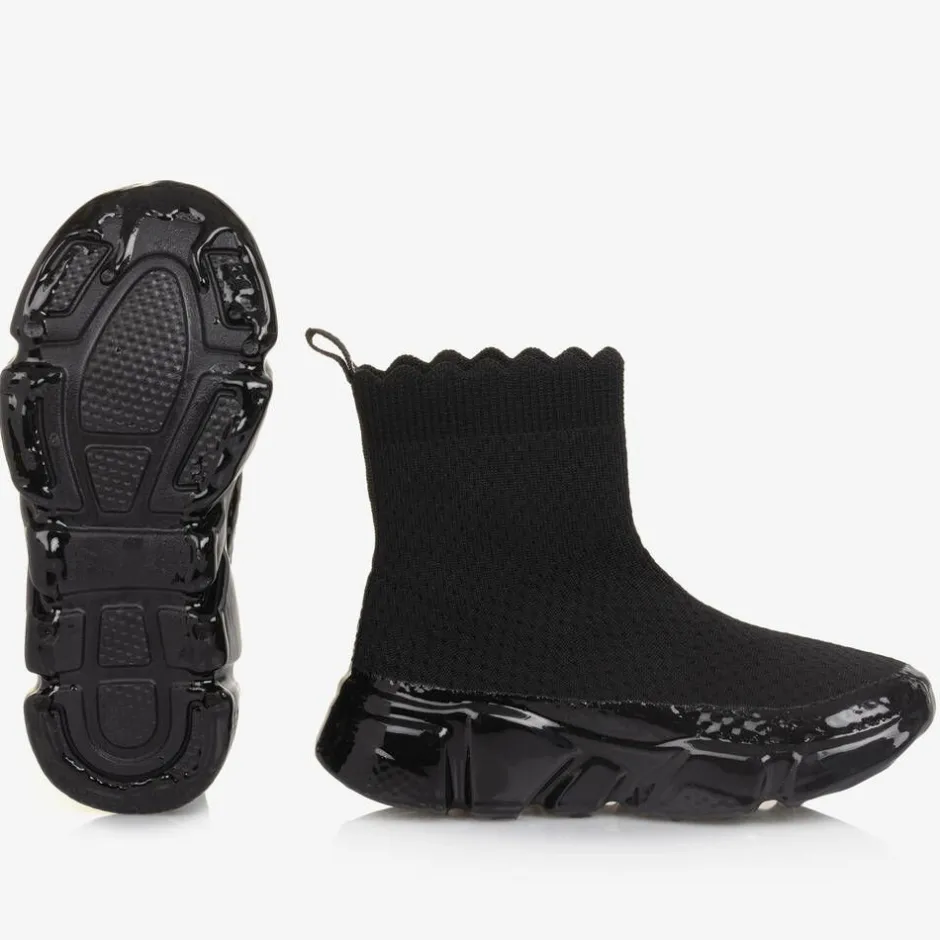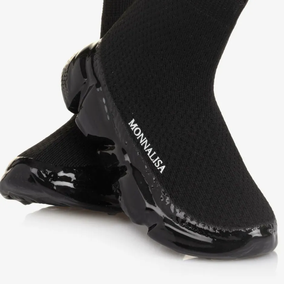 Black sock trainers for girls by Monnalisa, made in soft mesh textile with a scalloped trim. Lightweight and easy to wear, they have a branded pull tab on the back, a white logo print on one side and a cushioned insole for comfort. The non-slip rubber outer sole has a lovely glossy sheen and improves grip on slippery surfaces.