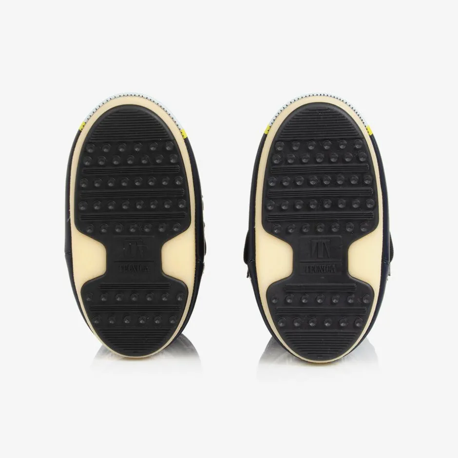 Nav blue Icon Dragon snow boots for boys by Italian brand Moon Boot, with a fun dragon face printed on the foot and 3D wing appliqués on the sides. Heavily padded and insulated for warmth, these sturdy, long boots are made in durable water-repellent fabric with colourful stripes and have a drawstring at the top to keep the weather out. They have a comfortable cushioned insole and a lightweight, two-tone thermoplastic sole with suction pads for improved grip. Trimmed with faux leather, the boots have printed white logos for an unmistakable designer look, and are complete with decorative tubular laces. The technological foam lining will feel snug at first but will mould to the size and shape of the foot after a few hours of wear.