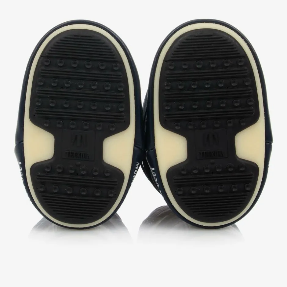 Navy blue snow boots for baby boys and girls by Italian label, Moon Boot. In the brand's original, iconic style, these water-repellent and ultra-resistant boots have a white logo print panel and tie-up laces for a signature look. Generously padded, they have a drawstring on the cuffs for a warm and comfortable fit. The thermoplastic rubber soles feature tiny suction pads to improve grip. The technological foam lining will feel snug at first but will mould to the size and shape of the foot after a few hours of wear.