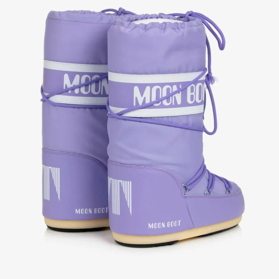 Lilac purple snow boots for boys and girls by Moon Boot, with a white logo print panel for a bold, branded look. Heavily padded and ultra resistant in the original style, they feature a two-tone thermoplastic sole with little suction pads at the bottom for improved grip. They have faux leather trims, a stylish lace-up look and a drawstring ties on the ankles to lock in warmth. The technological foam lining will feel snug at first but will mould to the size and shape of the foot after a few hours of wear.