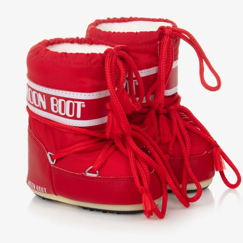 Red snow boots for baby boys and girls by Italian label, Moon Boot. In the brand's original, iconic style, these water-repellent and ultra-resistant boots have a white logo print panel and tie-up laces for a signature look. Generously padded, they have a drawstring on the cuffs for a warm and comfortable fit. The thermoplastic rubber soles feature tiny suction pads to improve grip. The technological foam lining will feel snug at first but will mould to the size and shape of the foot after a few hours of wear.