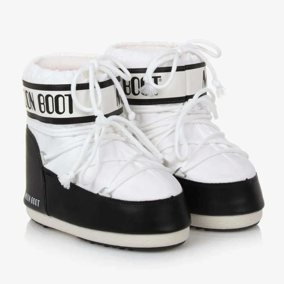 White and black shorter-length snow boots for boys and girls by Moon Boot, with a bold logo print panel for an iconic look. Heavily padded and ultra resistant in the signature style, they feature a two-tone thermoplastic sole with little suction pads at the bottom for better grip. They have branded faux leather trims, a stylish lace-up look and drawstrings on each ankle to lock in warmth. The technological foam lining will feel snug at first but will mould to the size and shape of the foot after a few hours of wear.